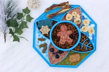 Beautiful, big and bold slow feeder and licking pad. Add a touch of fantasy to your pets bowl while stimulating it's mind and providing a better digestion. Non-toxique human grade matérial, flexible, suction cups and dishwasher safe. Dimensions: 28cm x 26.5 cm. Central bowl: 12 x 12 inches. 24.99$